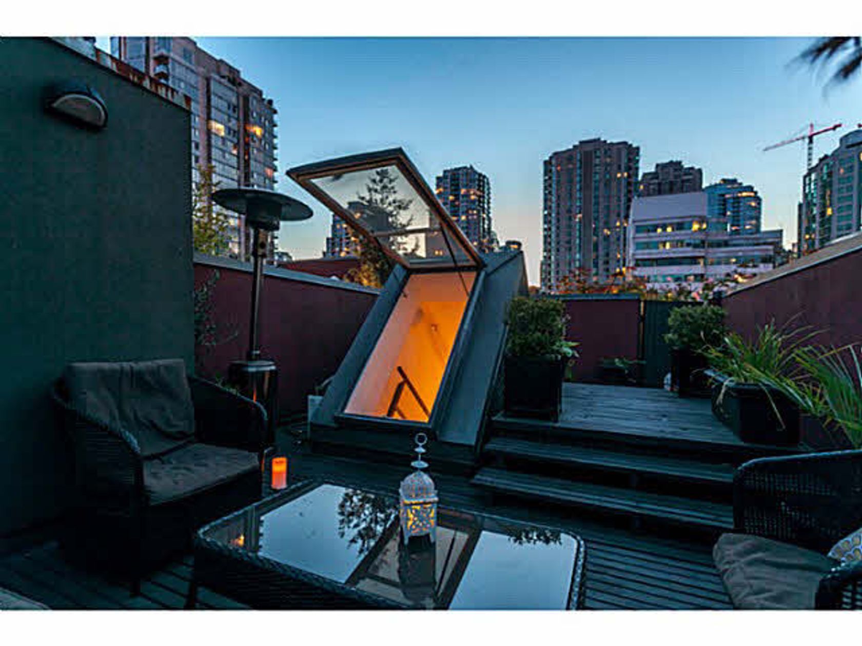 Yaletown Penthouse Loft @ "The Hooper Building". Open 1-5 Sat to Wed. 1910 Warehouse Conversion. Abundant floor space and natural light in this Dramatic Live/Work Loft. Bonus: a direct access private roof deck of 368 sqft. Featuring double height ceilings, solid hardwood flooring on the main level, a focal gas fireplace and European tilt & turn windows and contemporary roller window blinds. "As New Condition". GST included. Prepaid rental parking provided.