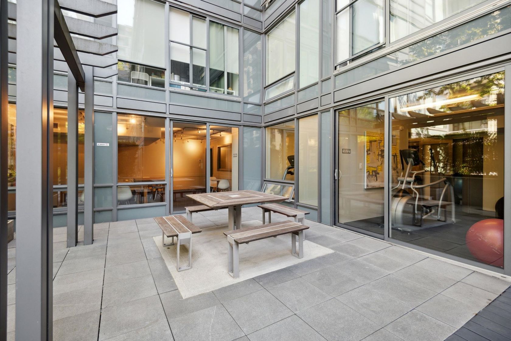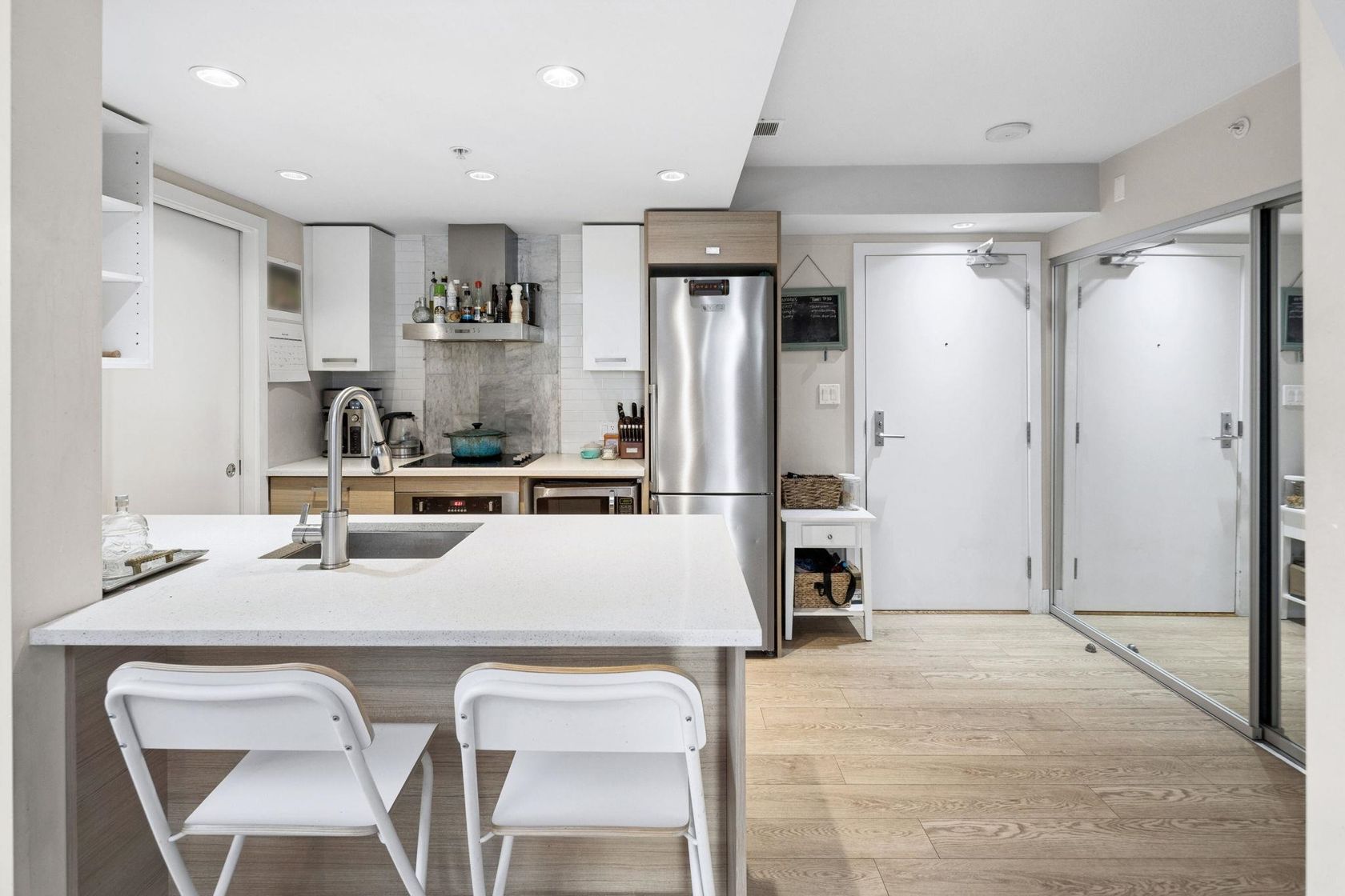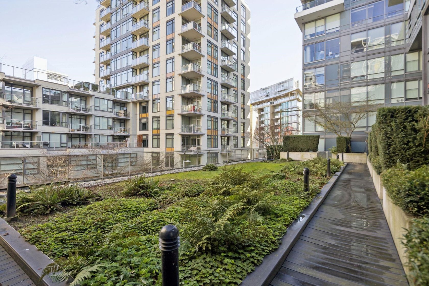 Welcome to The Residence at the West! Located in one of the most desirable neighbourhoods, Olympic Village - A False Creek waterfront community, steps to the seawall, top restaurants, shopping & more.. a one-off floorplan: open concept 1 bed and large den (could be 2nd bedroom), gourmet kitchen with premium appliance, and granite countertops, floor to ceiling windows which allows plenty of natural light, and the show stopper - a massive PRIVATE PATIO! Spa-style bathroom with rainfall shower, large flex room / pantry off the kitchen than can accommodate an office. This unit has it all! come see if this can be your next home!